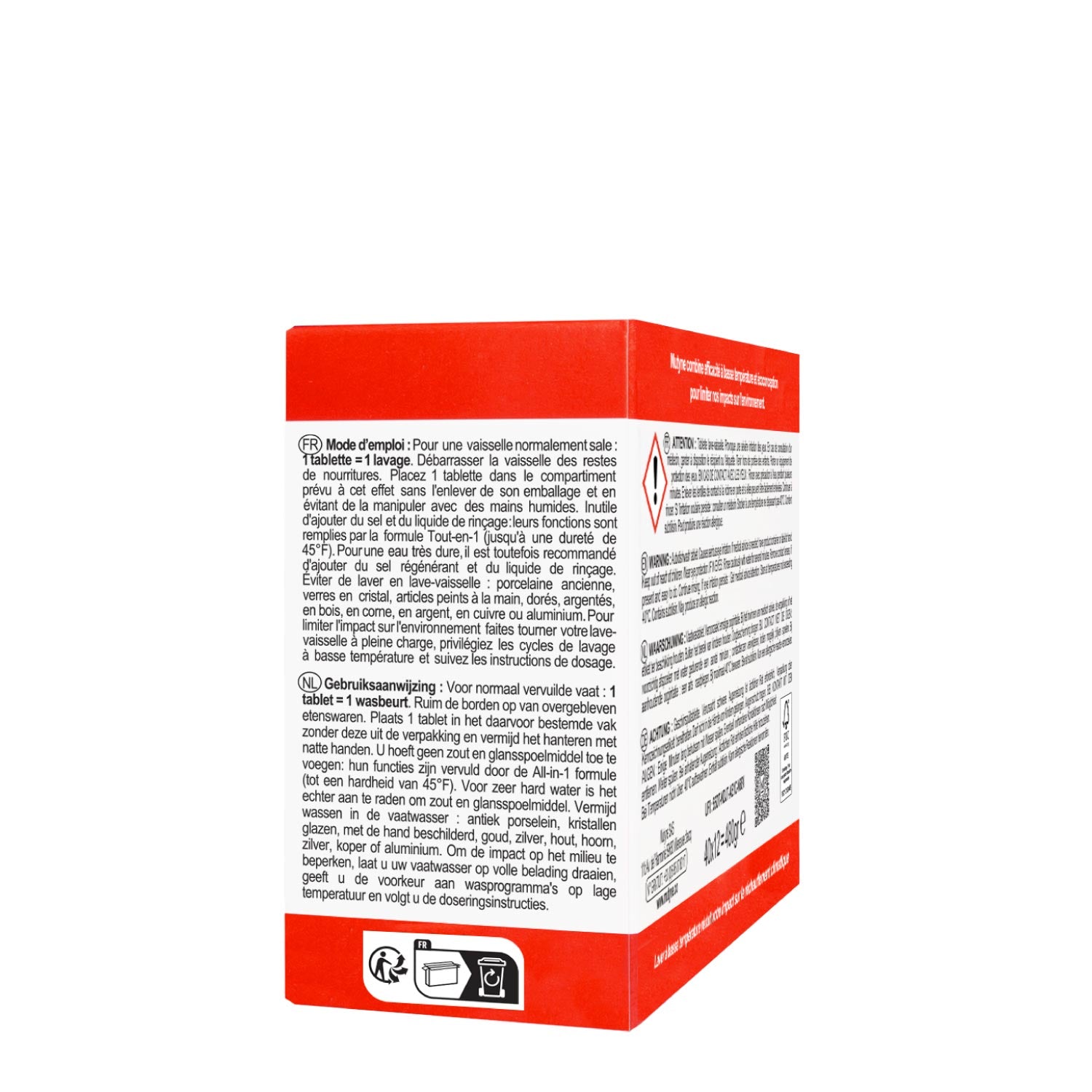 Pour respecter l'environnement, faites tourner votre lave-vaisselle à pleine charge, privilégiez les cycles de lavage à basse température et suivez les instructions de dosage. Débarrasser la vaisselle des restes de nourritures, ne surtout pas rincer la vaisselle. Placez une pastille lave vaisselle dans le compartiment prévu à cet effet sans l'enlever de son emballage et en évitant de la manipuler avec des mains humides. Inutile d'ajouter du sel et du liquide de rinçage : leurs fonctions sont remplies par la formule Tout-en-1 (jusqu'à une dureté de 45 °F). Pour une eau très dure, il est toutefois recommandé d'ajouter du sel régénérant et du liquide de rinçage. Eviter de laver en lave-vaisselle: porcelaine ancienne, verres en cristal, articles peints à la main, dorés, argentés, en bois, en corne, en argent, en cuivre ou aluminium.